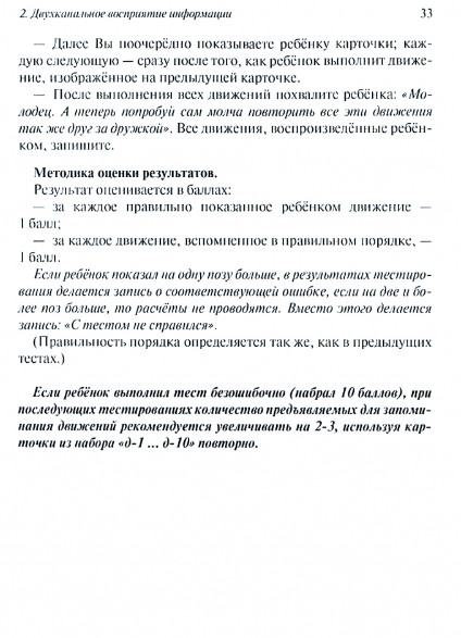 Авторы: Кислов А.В., Пчелкина Е.Л. Из этого небольшого по объёму пособия Вы сможете много узнать о своём ребёнке такого, что в заботливых руках станет инструментом развития его талантов. С помощью простых и доступных тестов сможете проверить не только отдельные виды памяти (зрительную, слуховую, тактильную, двигательную), но и работоспособность каналов восприятия информации, и эффективность взаимодействия между каналами, а в целом — получить представление о базовых ресурсах развития памяти ребёнка. Кроме того, Вы получите рекомендации по использованию этих ресурсов для создания фундамента важнейших качеств личности.